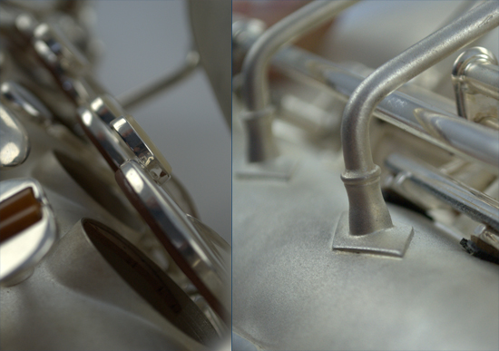 For example, let’s look at the upper stack of a vintage alto. From top to bottom, the five touches in the top stack are: Front F, B, Bis Bb, A/C and G. The curve or angle that the touches or pearls reach the player’s hand give the player feedback and change how the player feels about the instrument and certainly affects their technique. Generally, key touches should be parallel to the body and even with each other when the keys are closed.