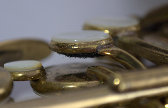With Front F specifically, the technique of the player is often taken into account. Some players roll up to Front F and some lift their finger and place it on the Front F. Out of necessity, some players lift or roll but would prefer to do the other. Depending on the player’s technique, which can often be ascertained by looking at lacquer or key touch wear, the location of the Front F is set. On some vintage instruments, this includes choosing the correct pearl for the Front F touch. Generally, a concave pearl of the same height and parallel with the B pearl is a quick and comfortable set up to a player who lifts his finger to play Front F. For the player who rolls up to Front F, a convex pearl tilted at an angle to the B pearl is fast and comfortable. To achieve the latter, it is often necessary to file the base of the pearl holder where it contacts the B pad cup.Of course, the purpose of the Front F is to open the Palm F pad. The dry-fitter notes how far the Front F touchpiece opens the Palm F key pad and make adjustments to a vintage mechanism which was never intended to be adjustable. The goal in this adjustment is to achieve a proper key opening without the introduction of lost motion.