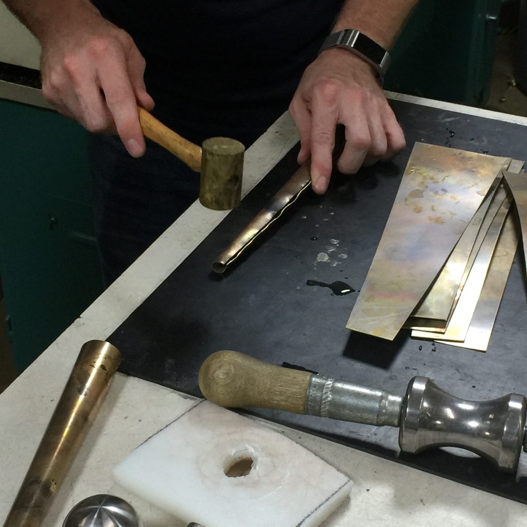 Once we have determined the exact specifications and made the tooling for a model, we can start manufacturing necks. First, a trapezoidal shape of brass is cut, folded over a mandrel, and brazed together in the form of a roughly tapered tube. It is then hand hammered into a smooth uniform shape. Next, the neck is filled with pitch to keep it from folding over on itself and bent into the appropriate curve. At this point, many neck makers are ready to add the tenon and octave pip, and in the early days, we were too.